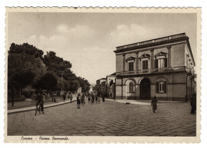 Purtroppo questi palazzi sono in larga parte scomparsi “grazie” al sacco edilizio degli anni ’60-’80 del secolo scorso (ne parlo qui) che ha cancellato l’architettura ottocentesca dell’abitato di Canosa sostituendola con condomini di dubbio gusto estetico. Alla fine di questo indegno processo, per una città con la storia di Canosa, è rimasta l’eredità di un centro cittadino senz’anima in cui palazzoni anonimi la fanno da padrone, punteggiati da quei pochi palazzi storici, scampati alla demolizione, che rimandano ad un passato in cui si faceva a gara per abbellire la città con architetture ricercate. Qui sotto un esempio eclatante di tale sfregio: Piazza Boemondo negli anni ’30 con il maestoso Palazzo Sinesi e oggi con il mega condominio costruito tra il 1969 ed il 1970.