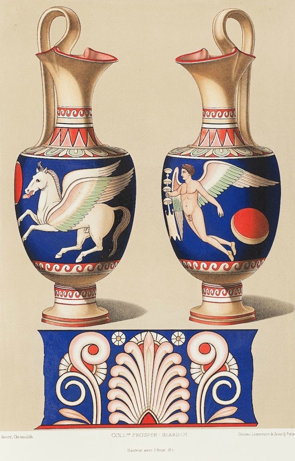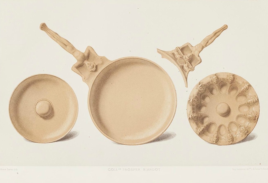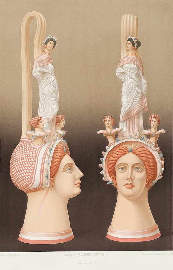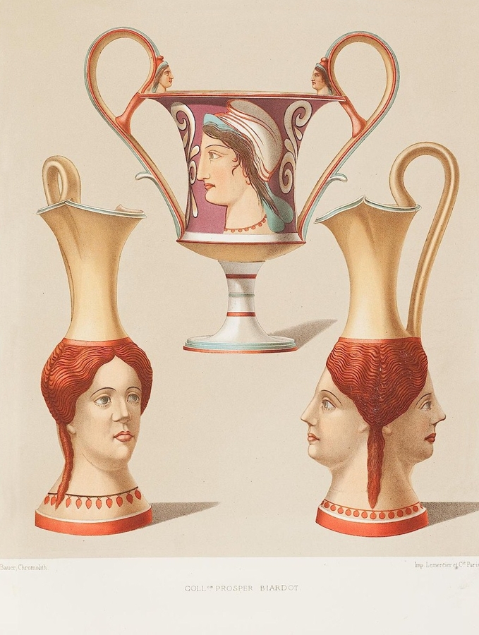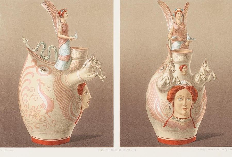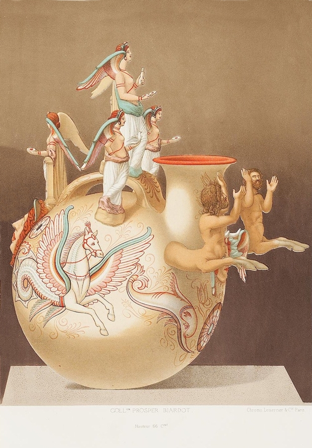 Nel 1872 Prosper Biardot pubblica “Les Terres-Cuites Grecques Funebres; Dans Leur Rapport Avec Les Mysteres de Bacchus accompagnes d’un atlas de 54 planches noires et coloriees” (ed. Librairie Firmin Didot Freres, Paris). La pubblicazione è composta di un ampio volume di testo e di un atlante figurato, comprendente ben 54 acquerelli, di cui numerosi nel colore naturale della terracotta, e il resto a più colori. E’ la prima testimonianza visiva della straordinarietà del corredo funerario degli Ipogei Lagrasta. Gli acquerelli raffigurano i 26 pezzi di terra cotta policroma canosina, acquistati da Biardot a Canosa nel 1846, ed oggi esposti al Museo del Louvre nella sezione Art grec classique et hellénistique (Italie du Sud). Di eccezionale qualità esecutiva, gli acquerelli sono una vera e propria istantanea sullo stato di conservazione al momento della scoperta dell’ipogeo Lagrasta I che come abbiamo visto all’epoca sconvolse per dimensioni, qualità e quantità del corredo.
