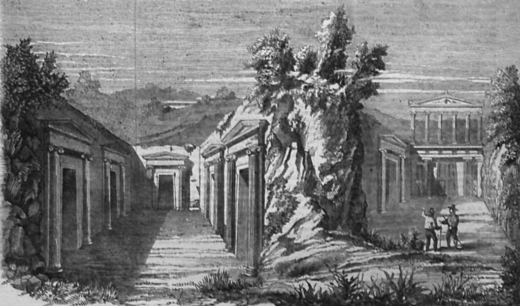 Accanto a questo ipogeo, fu trovato, come ho già detto, quello che fu ritenuto il plesso più importante, perchè conteneva un prospetto di un superbo mausoleo, che alcuni affermarono essere l’ingresso principale, o uno degli ingressi principali di tutti gli ipogei. Era formato da quattro colonne dorico-pestane, con capitelli triglifi a cornicione di marmo ordinario locale, ed era sormontato da altre cinque colonne joniche. Nella parte superiore, al centro, del mausoleo, fu trovata una statua marmorea senza testa, di grandezza naturale, la quale decorava il prospetto. La porta in marmo o in pietra locale era lavorata e divisa in riquadri; tra le colonne doriche spiccavano due nicchie a fondo rosso, in una delle quali fu trovata una piccola statua di terracotta. Il Bonucci afferma che le proporzioni snelle ed eleganti del prospetto erano simili a quelle dell’ingresso delle tombe del re della Licia e di altre numerose dell’Asia Minore.” (…)
