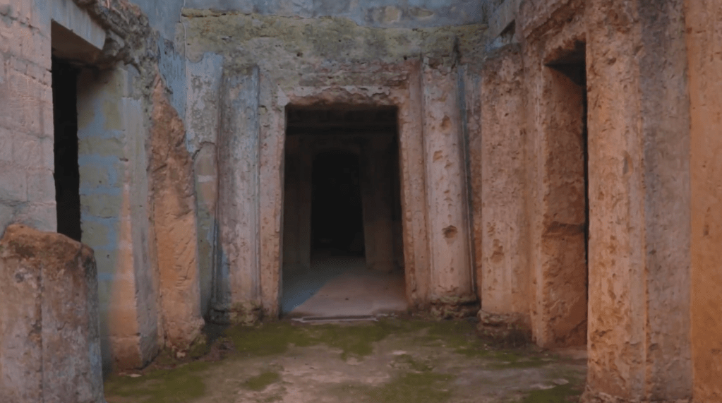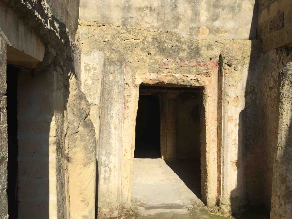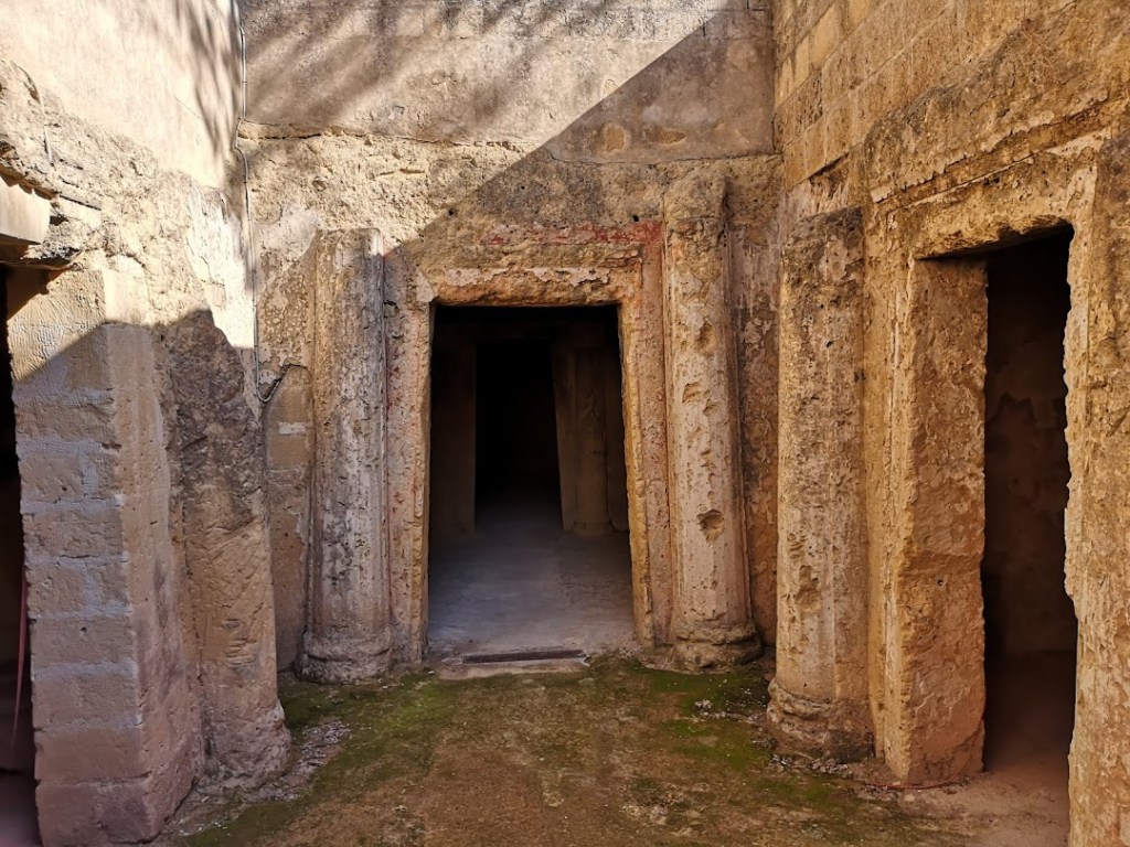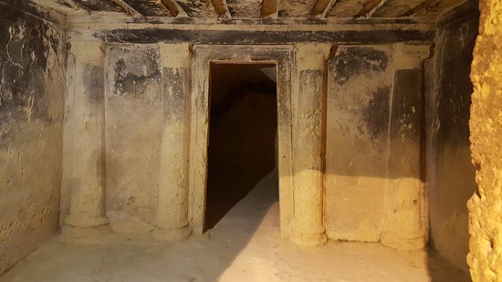 Le travi erano dipinte a color del legno, mentre le pareti laterali erano rosse (tracce dei due colori sono ancora visibili). Una seconda stanza e talvolta una terza, con proporzioni che vanno più restringendosi, si succedono dopo la prima; comunicano fra loro per mezzo di porte anch’esse più strette alla sommità, secondo lo stile egizio. La volta di queste stanze è liscia e le pareti inornate. Un muretto parallelo a quello dell’ingresso principale divide la prima stanza dalla seconda ed era fregiato di colonne joniche e di pitture consistenti in due finestrini, o in diversi riquadri a fondo rosso e bianco; vi erano raffigurati uccelli dal volto umano e sirene dello stesso tipo di quelle che si trovano spesso sui vasi detti volgarmente egizi e dagli archeologi francesi creduti tirreno- fenici. Da questa stanza si comunicava con altri edifizi funebri per mezzo di altre porte di marmo situate agli angoli in basso delle pareti laterali.
