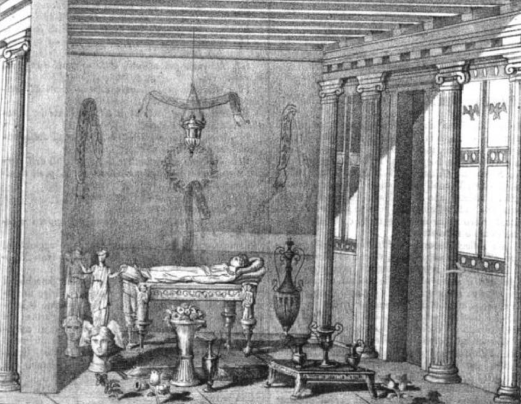 (…) I disegni e i fregi che componevano la suppellettile erano eseguiti a vari colori con pezzi a mosaico disseminati in oro e tutti lavorati con un’industria e con un’arte ignota ai moderni. Alcune statue, diversi vasi a forma d’otre, su ciascuno dei quali poggiavano in vari atteggiamenti circa quindici statuette ed infine altre grandi teste che sostenevano sirene, figure di sacerdotesse ed amorini, tutte di terracotta variamente e con somma grazia ed eleganza dipinte, erano collocate ai piedi degli illustri defunti. Vasi e stoviglie dipinte con rappresentazioni sacre e con scene domestiche presentavano negli angoli delle stanze le forme dei calici di anfore pugliesi e di crateri.