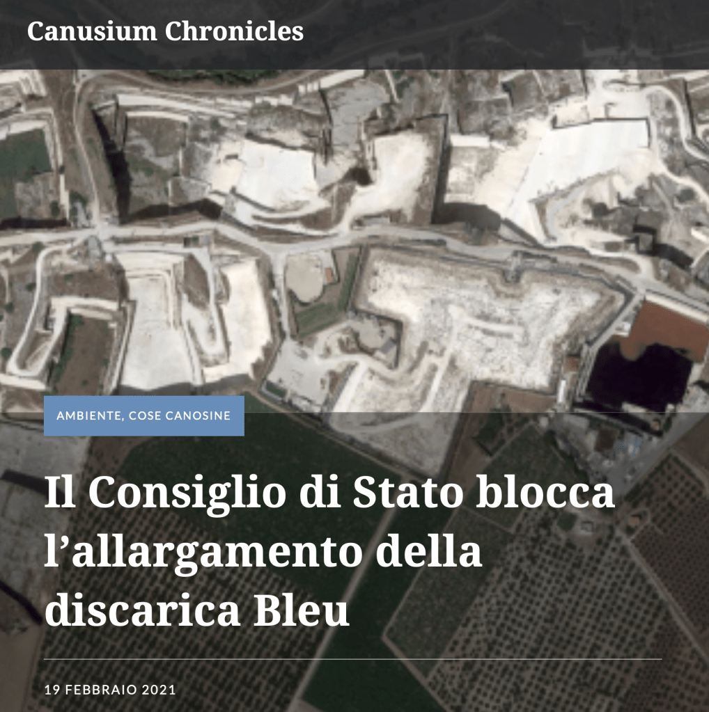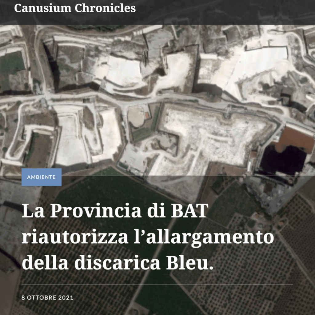 Il 9 febbraio 2021 il Consiglio di Stato ha annullato, per carenza di istruttoria, la Determinazione Dirigenziale della Provincia di Barletta – Andria – Trani che aveva espresso giudizio favorevole di compatibilità ambientale sull’ampliamento della discarica Bleu di Contrada Tufarelle.