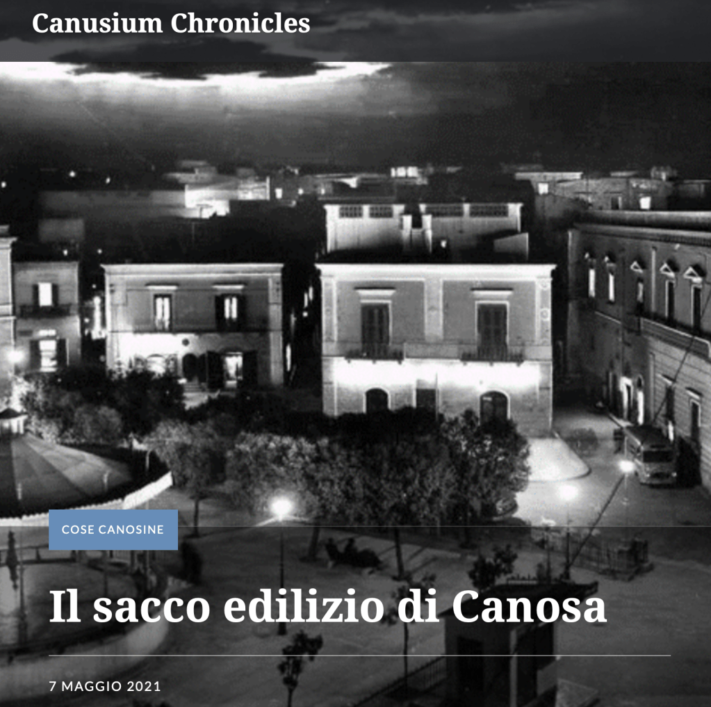 Di quei palazzi in larga parte scomparsi “grazie” alla intensa opera di cementificazione del centro cittadino che ne ha cancellato l’architettura ottocentesca, sostituendola con edifici di dubbio gusto estetico. Alla fine di questo indegno processo, per una città con la storia di Canosa, è rimasta l’eredità di un centro città senz’anima in cui palazzoni anonimi la fanno da padrone, punteggiati da quei pochi palazzi storici, scampati alla demolizione, che rimandano ad un passato in cui si faceva a gara per abbellire la città con architetture ricercate.