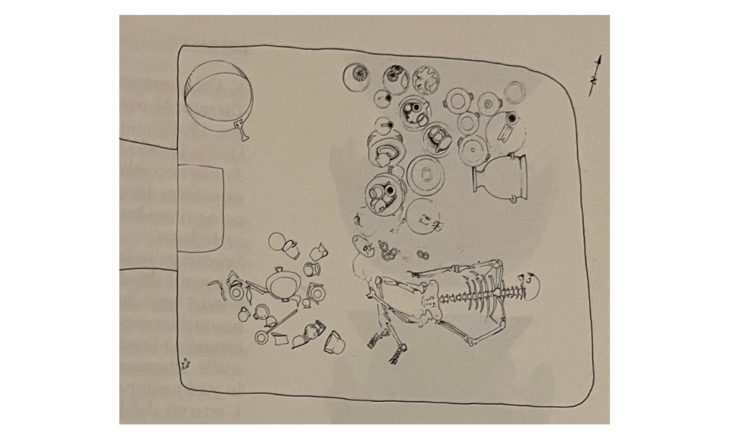 Il corredo della deposizione di destra (52 pezzi) comprendeva alcuni oggetti strettamente pertinenti al cadavere e ad esso vicini: una cuspide di lancia ed un puntale di ferro, un cinturone di bronzo ed altri due oggetti metallici. La maggior parte del corredo era posta, però, anche in questo caso ai piedi dei defunto, nell’angolo anteriore destro della cella, e consisteva in vasi fittili e di bronzo, in 4 spiedi di ferro e in altri oggetti di bronzo. Infine un piccolo nucleo di sette vasi era collocato nella zona centrale della cella, a destra e non lontano dal defunto. Il corredo della deposizione di sinistra, comprendente 81 pezzi, era formato da ceramiche, oggetti di bronzo e ferro. Accanto allo scheletro e aderenti alla parete della cella si trovavano una cuspide di lancia di ferro e un cinturone di bronzo, mentre sullo scheletro erano adagiati quattro spiedi di ferro. Ai piedi del cadavere, nell’angolo anteriore sinistro della cella, era stata collocata la maggior parte del corredo, comprendente ceramiche, recipienti di bronzo e strumenti di ferro. Un secondo, piccolo gruppo di oggetti era collocato a sinistra dello scheletro, verso il centro della cella e comprendeva vasi fittili di piccole dimensioni.” Ettore Maria de Juliis da “Principi Imperatori Vescovi – duemila anni di storia a Canosa” © Marsilio Editore