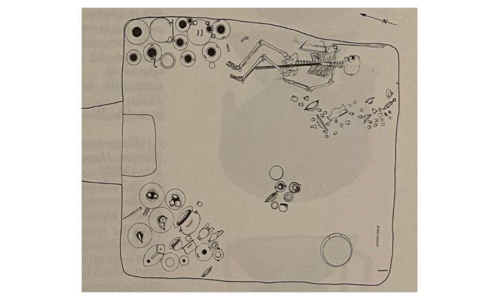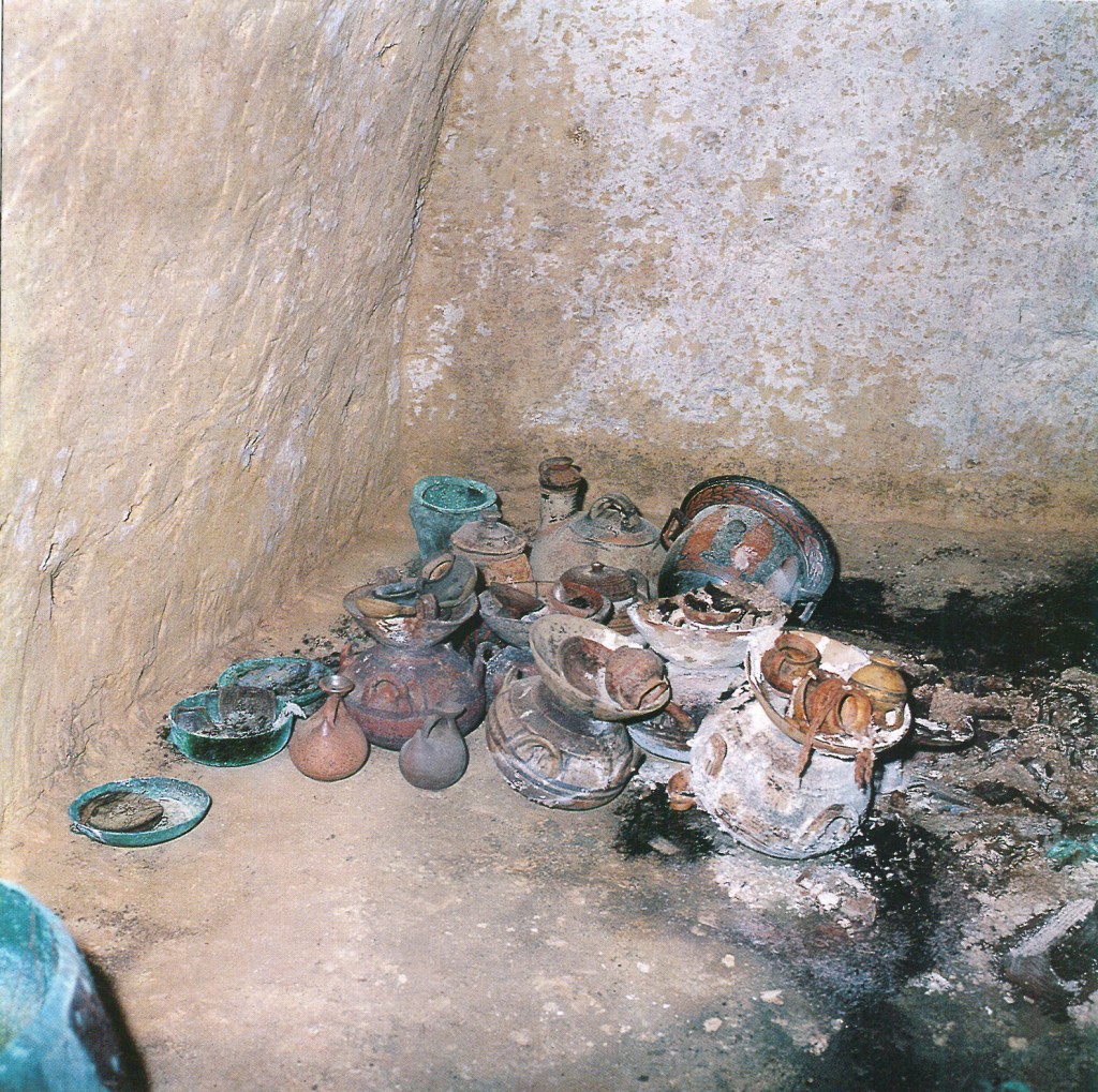 “La cella B, a volta piana, conteneva due deposizioni; gli scheletri erano collocati lungo le pareti lunghe, con i piedi verso l’ingresso, e la testa verso il fondo (sud). Lo scheletro di destra appariva quasi totalmente distrutto dal crollo di pietre della volta in seguito alla perforazione che ha portato alla scoperta. Lo scheletro di sinistra presentava una posizione analoga a quello della cella A. Anche le ossa di questo scheletro, dall’esame di laboratorio, sono risultate esposte a temperature più o meno elevate, che le hanno calcinate e carbonizzate. Come nella cella A è attestata quindi una cremazione o una semi cremazione del cadavere in situ, con un rito funebre distinto in due tempi. Anche in questa cella sono presenti ampie zone del battuto pavimentale coperte da resti di cenere o di frammenti lignei semi carbonizzati, appartenenti. ad una o più pire, parzialmente eliminati dopo la fase di cremazione per fare posto ai numerosi oggetti di corredo delle due deposizioni.
