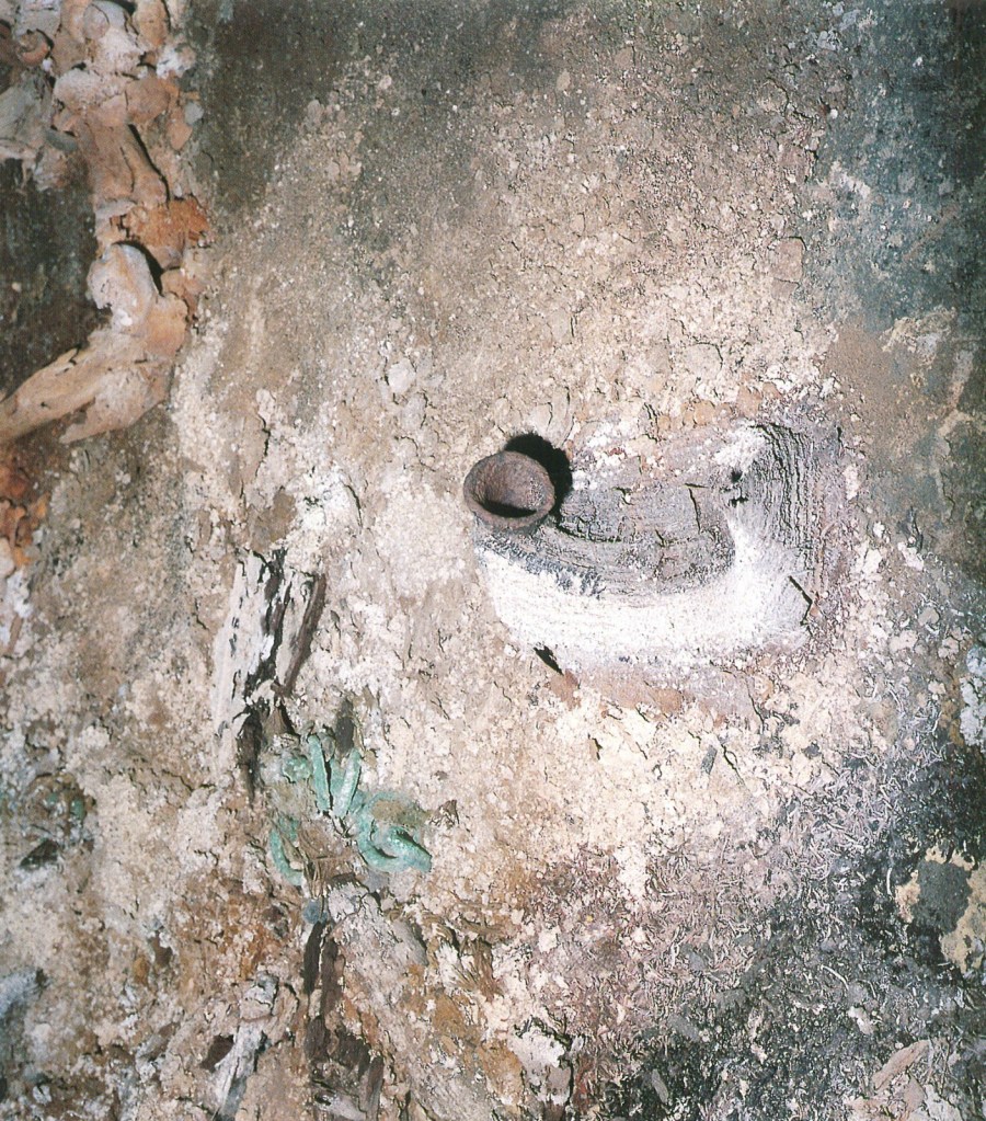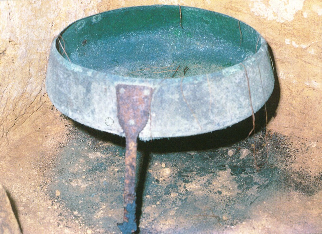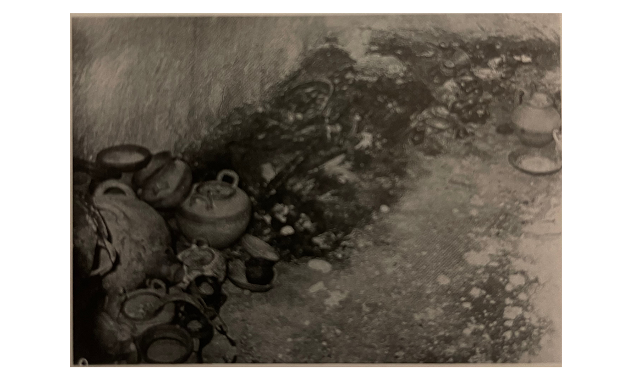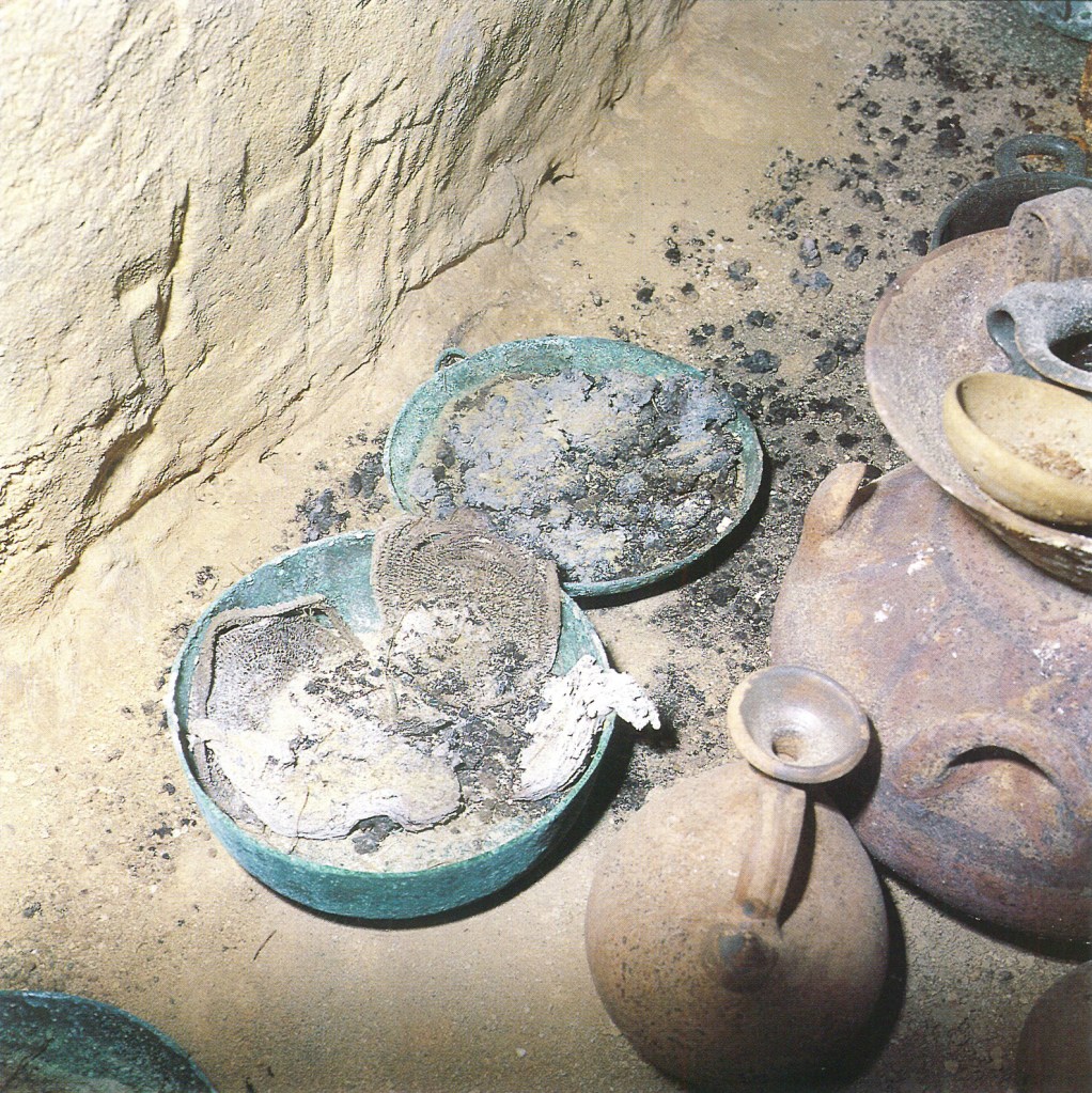 La maggior parte degli oggetti di corredo, 71 pezzi, e le ultime offerte rituali devono essere stati deposti in un secondo momento dopo l’esaurimento della pira. Tra le ceneri di quest’ultima furono recuperati numerosi ossi calcinati, appartenenti, probabilmente, ad un animale sacrificale, ed una coppia di morsi equini di bronzo, con resti di corregge di cuoio. Nella stessa zona fu raccolto un puntale di ferro molto allungato. Ai limiti della zona bruciata, verso la porta, era stato deposto, nell’ultima fase del rito funebre, un askos ad anatrella, formato da fibre vegetali intrecciate. Il resto del corredo era situato in due punti distinti: ai piedi del defunto e alla sua destra, nella metà nordorientale della cella. Il prima gruppo, posto immediatamente a destra dell’ingresso, comprendeva oggetti pertinenti al focolare e al banchetto: spiedi e alari di ferro, un mestolo, un oinochoe, un olpe e un bicchiere di bronzo; infine numerosi vasi da mensa di terracotta. A questo gruppo si ricollega il calderone di bronzo su tre piedi di ferro posto, isolato, nell’angolo opposto della cella, a sinistra dell’ingresso. Il secondo gruppo di oggetti era costituito soprattutto da fittili. Di notevole interesse è, tuttavia, la presenza di una treccia di vimini su un’olla daunia, di un ceppo di legno all’interno di un vaso a fruttiera e, soprattutto, di tre patere di bronzo, allineate lungo la parete lunga contenenti frammenti di cortecce odorose, coperte da dischi composti da fibre vegetali. Infine, all’interno di altri vasi, più vicino alla zona della pira, è stata accertata la presenza di polvere d’osso calcinato, proveniente certamente dalla pira sacrificale.” Ettore Maria de Juliis da “Principi Imperatori Vescovi – duemila anni di storia a Canosa” © Marsilio Editore