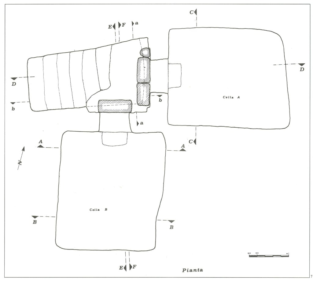 “La cella A, dalla volta a botte, era accessibile attraverso un gradino che consentiva di superare agevolmente il dislivello tra il piano del vestibolo e quello interno della ceIla, posto circa 50 cm più in basso. Su ciascuna delle pareti erano incisi dei rettangoli di dubbio significato. La cella conteneva un’unica deposizione, con lo scheletro nella metà destra, disposto secondo l’asse maggiore, con la testa verso il fondo (est) e i piedi verso l’ingresso (ovest). Il tronco era in posizione supina, le gambe flesse, il braccio destro disteso e parallelo al busto, quello sinistro leggermente flesso, con la mano poggiante sul bacino. Le ossa, in perfetta connessione anatomica, erano calcificate, il cranio risultava in pessime condizioni. Accanto allo scheletro, al centro della cella, fu rinvenuto uno spesso strato di cenere grigia e sotto c’era uno spesso strato carbonioso conservante ancora numerosi ceppi di legno, solo in parte carbonizzati. Si tratta, evidentemente, dei resti di una pira sacrificale con offerte in onore del defunto, che ne ha provocato la cremazione in situ.