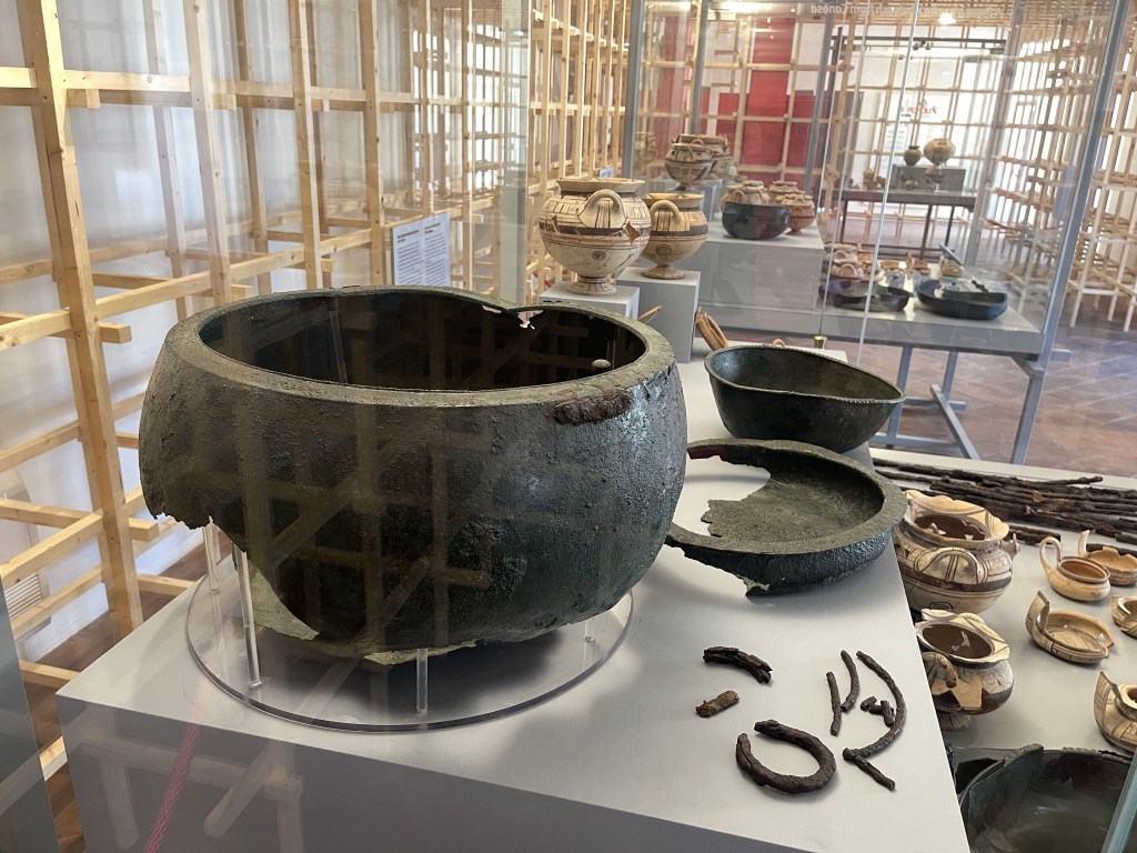 Esemplificativa dell’immagine funeraria della defunta è la presenza di oggetti che connotano l’hestia domestica: un grande calderone e diversi bacili in bronzo, il lebete, il fascio di spiedi e il coltello. Questi elementi oltre a testimoniare l’adozione di costumi aristocratici, sanciscono con un linguaggio esuberante e vistoso lo stacco del gruppo familiare cui apparteneva la donna defunta.