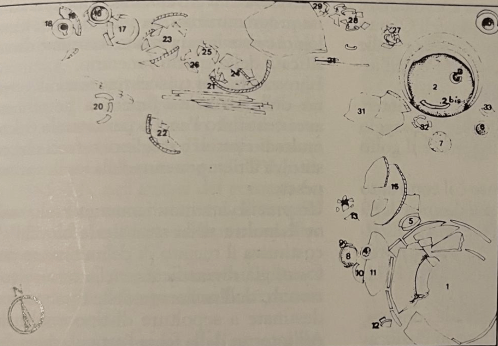 Tra i beni di prestigio della defunta era anche una coppa d’argento con anse piene, ritrovata in frammenti insieme con un numero non precisabile di frammenti ceramici geometrici. Complessivamente i vasi di corredo dovevano essere un ottantina, con tre pesi fittili e due bacili di bronzo ad orlo perlinato. Marisa Corrente da “Principi Imperatori Vescovi – duemila anni di storia a Canosa” © Marsilio Editore