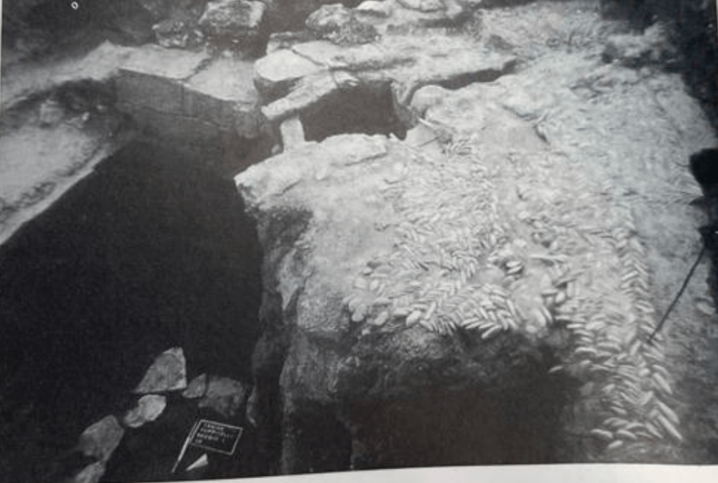 Durante il IV secolo a.C. nuove forme abitativo – industriali si espandono in un’area già destinata ad un piccolo sepolcreto di età arcaica. Un grande ambiente, preceduto da vestibolo o cortiletto con pozzo per la raccolta di acqua piovana, si allinea con una vasta struttura rettangolare con divisori interni e grandi pithoi interrati, dove la notevole quantità di pesi troncopiramidali fittili da telaio raccolti, sembra attestare la presenza di un opificio specializzato nella lavorazione della lana di cui vi era conoscenza nella tradizione scritta.