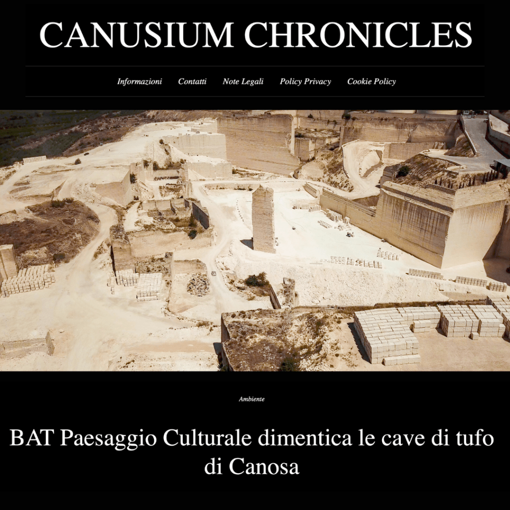 A noi canosini questa campagna appare piuttosto distopica. Nel video, tra le altre bellezze paesaggistiche della provincia, si vede lo splendido scenario della cava di bauxite di Spinazzola e alcune immagini delle cave di pietra presenti nella campagna tranese. Tutto molto bello ma manca un elemento importante: la cave di tufo di Canosa. Un esempio di archeologia industriale che testimonia lo sviluppo di un comparto di grande importanza per l’economia canosina.
