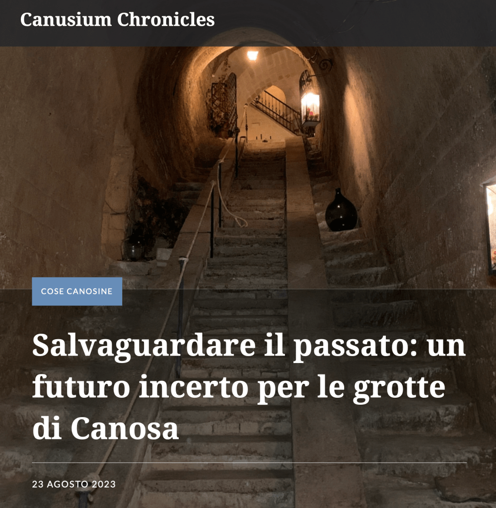 A marzo 2021 nel post “Le grotte di Canosa: un patrimonio perduto” raccontavo la storia delle cavità antropiche, per i canosini “le grotte”, presenti nel sottosuolo di Canosa. Ne auspicavo la loro valorizzazione. Da quella pubblicazione, un patrimonio perduto e dimenticato è tornato di attualità: qualche associazione ha ideato dei tour turistici, alcuni proprietari privati hanno intrapreso importanti lavori di restauro e valorizzazione.