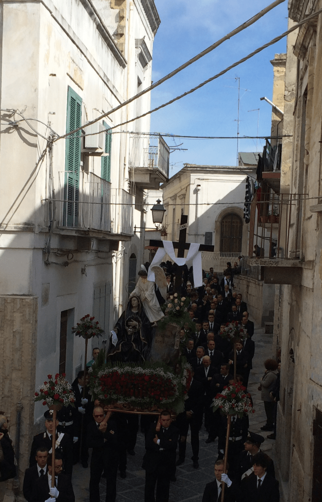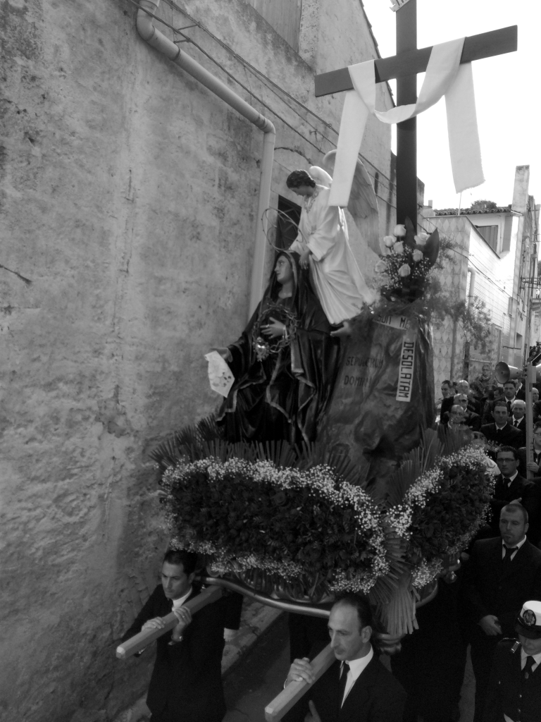 Nell’effigie portata in processione la Madre di Dio compare vestita a lutto, impietrita accanto alla croce, sorretta da un angelo consolatore e circondata di fiori rossi, ed è accompagnata dal nero corteo di donne disposte su più file con le braccia intrecciate “a catena”, il volto coperto dal velo nero che in alcuni casi ne lascia trasparire i lineamenti. L’emozione è tangibile, a volte il canto si mescola al pianto e il simulacro della Vergine, della quale queste donne si sentono sorelle ‘in pectore’, sembra quasi trasfigurarsi in una vibrante vitale presenza