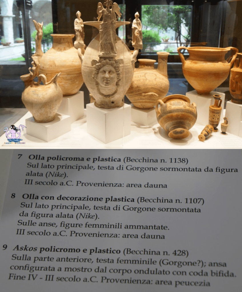 Tra questi spiccano venti reperti ceramici, scelti tra quelli sequestrati in Svizzera nel 1995 e successivamente confiscati, e tra questi venti reperti spiccano i vasi a decorazione plastica canosina (notare come si indichi genericamente area dauna il territorio di provenienza piuttosto che Canosa come indicazione del luogo di produzione).